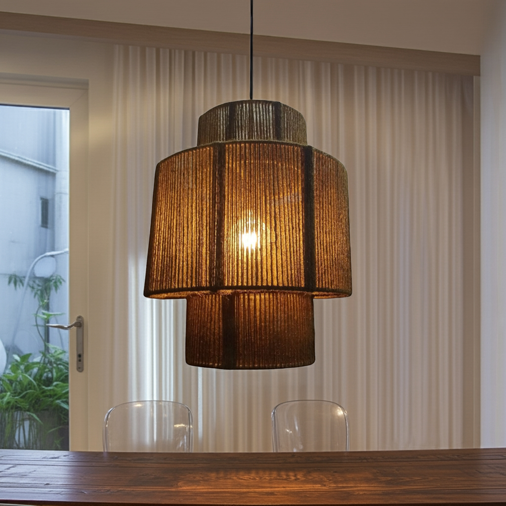 Luminária artesanal em juta envernizada com acabamento em imbuía, peça única e exclusiva criada manualmente. Estrutura preta com dimensões 43cm altura x 33cm diâmetro e 23cm de boca, soquete E-27, bivolt 110/220v e fio de 1,0m. Ideal para sala, quarto, escritório ou estabelecimentos comerciais. Combina elegância artesanal com funcionalidade, transformando qualquer ambiente com seu design exclusivo e irrepetível.